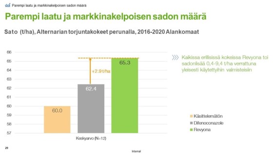 Peltokokeissa vuosina 2016-2020 Revyona antoi keskimäärin 2,9 tn/ha sadonlisän verrattuna markkinoilla oleviin yleisesti käytettyihin valmisteisiin.